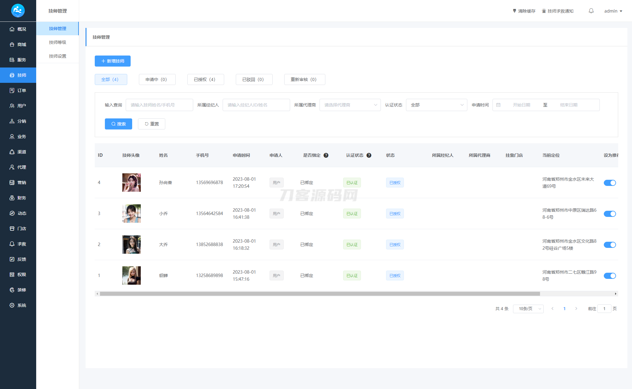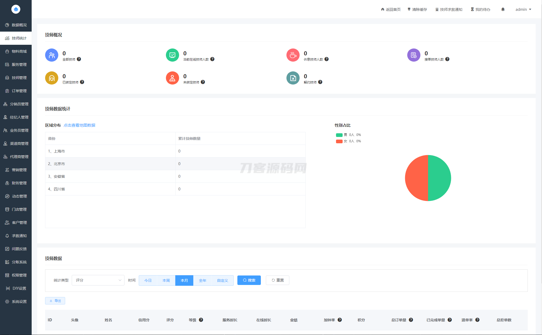 27、后台新增:技师统计(技师概况、技师数据统计、区域分布、技师数据等,可视化数据一目了然)