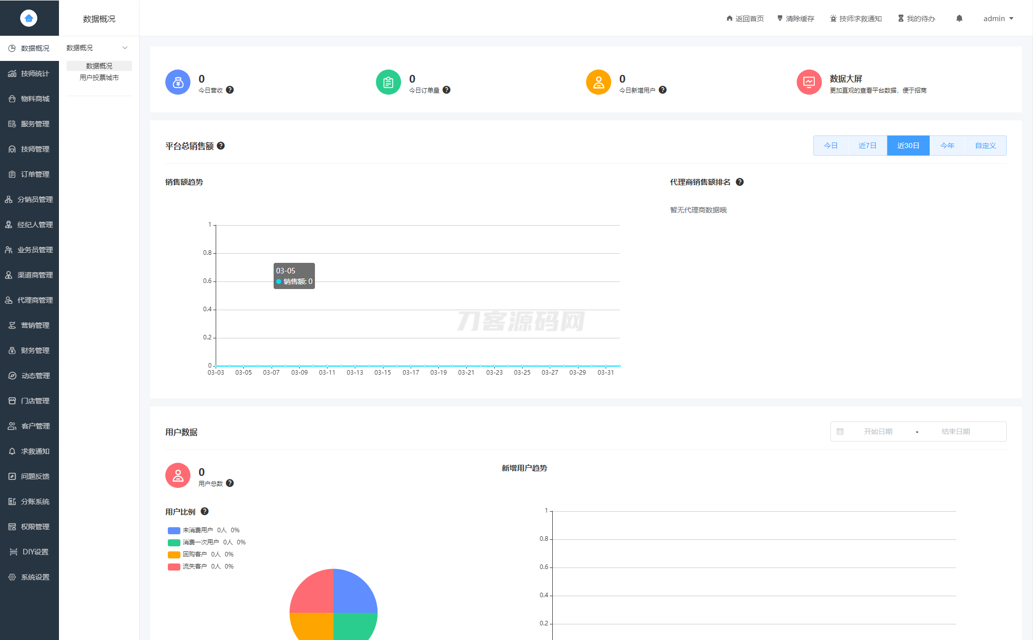 2、数据概况 (增加可视化数据大盘,代理商端可查看自己下面的技师服务时长、在线时长、业绩、积分、加钟率、退单率、退单数量、总订单量等数据,更加直观的查看平台数据,便于招商 )